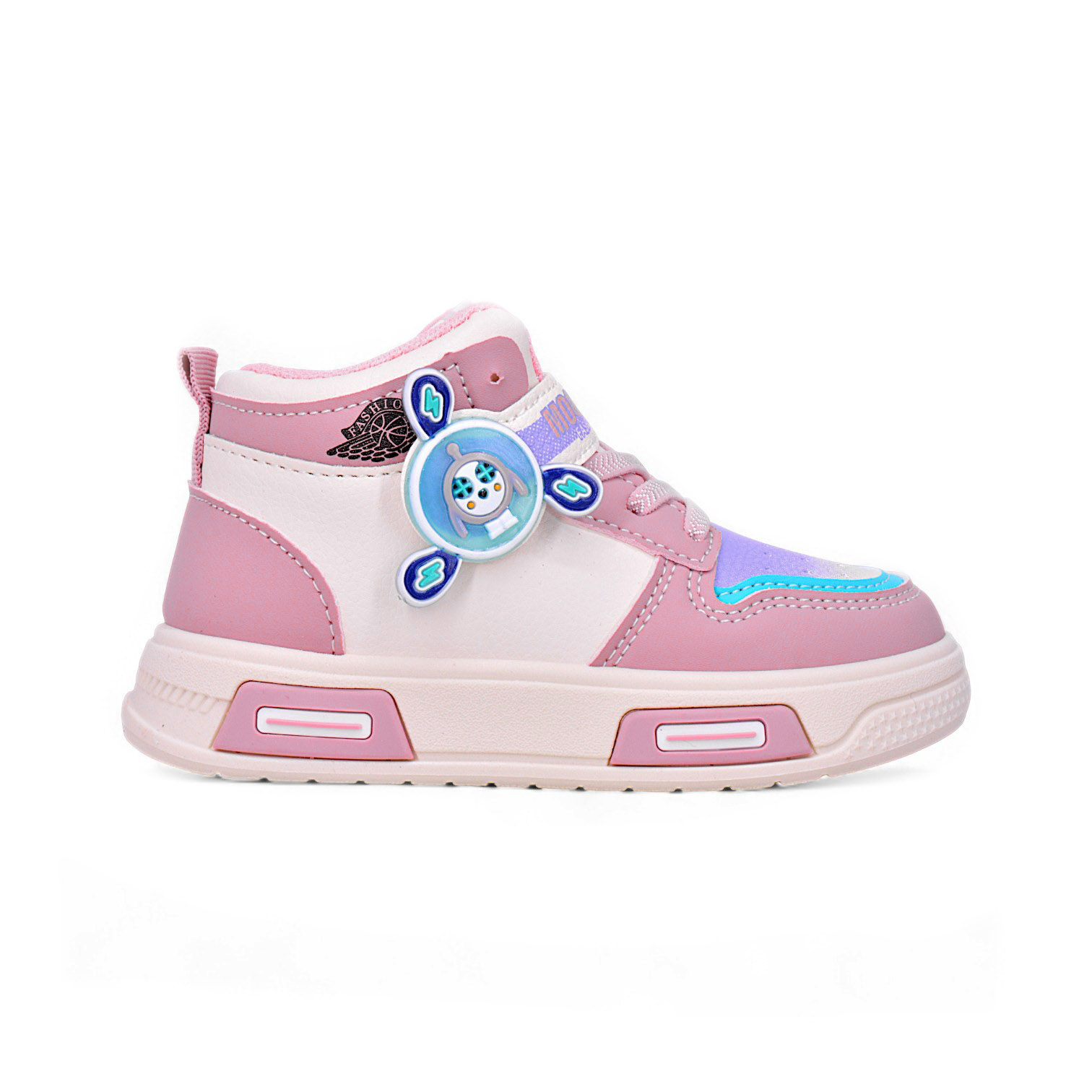 The KD1720 Cartoon Hero Mid-Cut Kids Sneakers are made for bold little adventurers who love to move in style! These sneakers feature a fun character badge detail that sparks imagination, while the mid-ankle design offers extra support for active play. Crafted from durable synthetic leather with a soft inner lining, they keep feet comfy from school hours to playground fun. The Velcro strap ensures a snug fit, while the non-slip sole adds confidence with every step. Available in eye-catching pink and black-and-white designs, KD1720 brings the perfect mix of cuteness and durability!