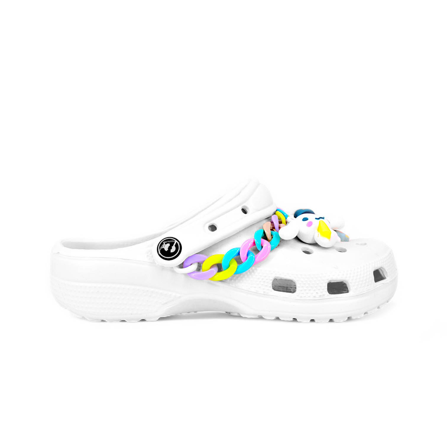 Step into comfort and style with the CHP510 Ladies Crocs-Style Chain Chappal – designed for women who love a perfect mix of fashion and functionality. These slip-on clogs come with a trendy multi-color chain accessory and cute 3D character charms that make your footwear stand out.