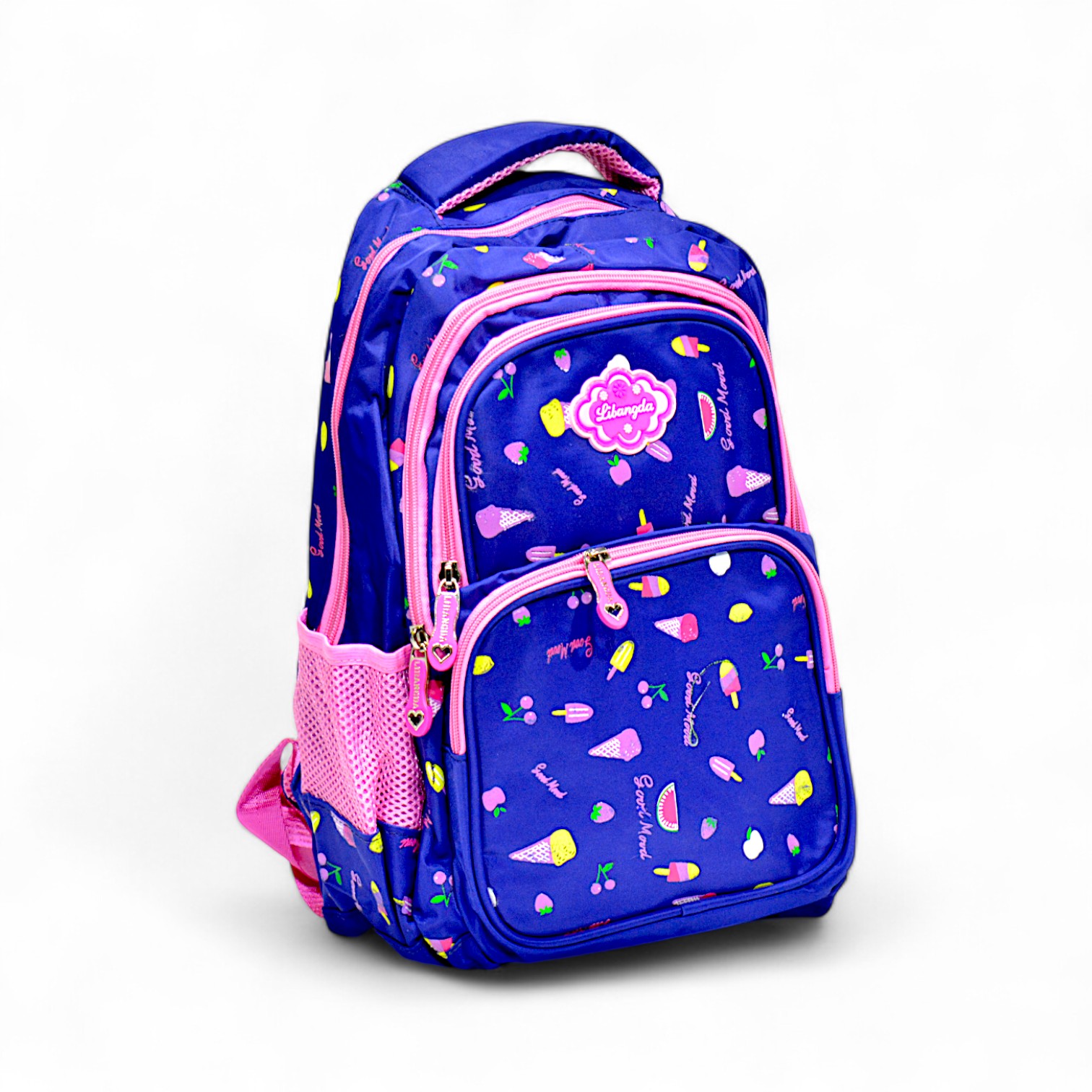 Design: Fun ice cream & fruit print in vibrant blue and pink with matching zippers – kids will love the cheerful look.